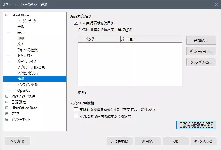 まずはオプション設定画面から詳細項目を開き、「上級者向け設定を開く」ボタンをクリックします。