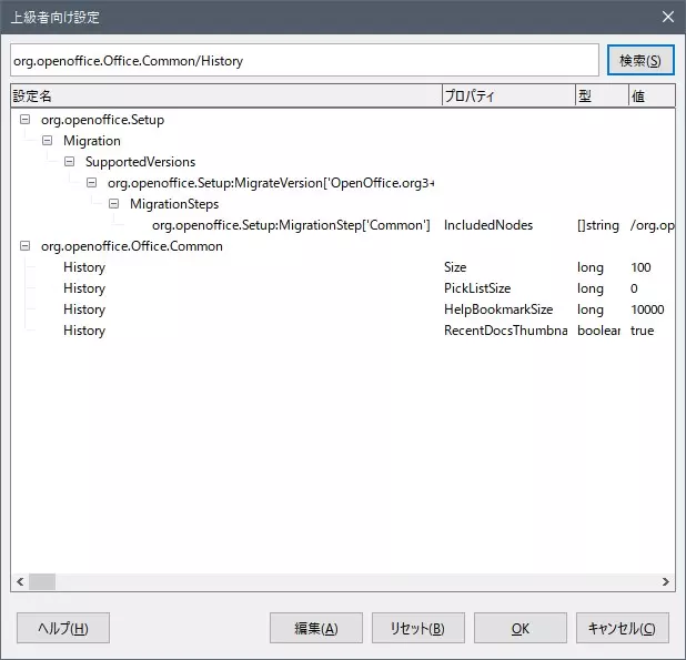 “org.openoffice.Office.Common/History” を検索し、 “PickListSize” を編集して値を “0” にします。